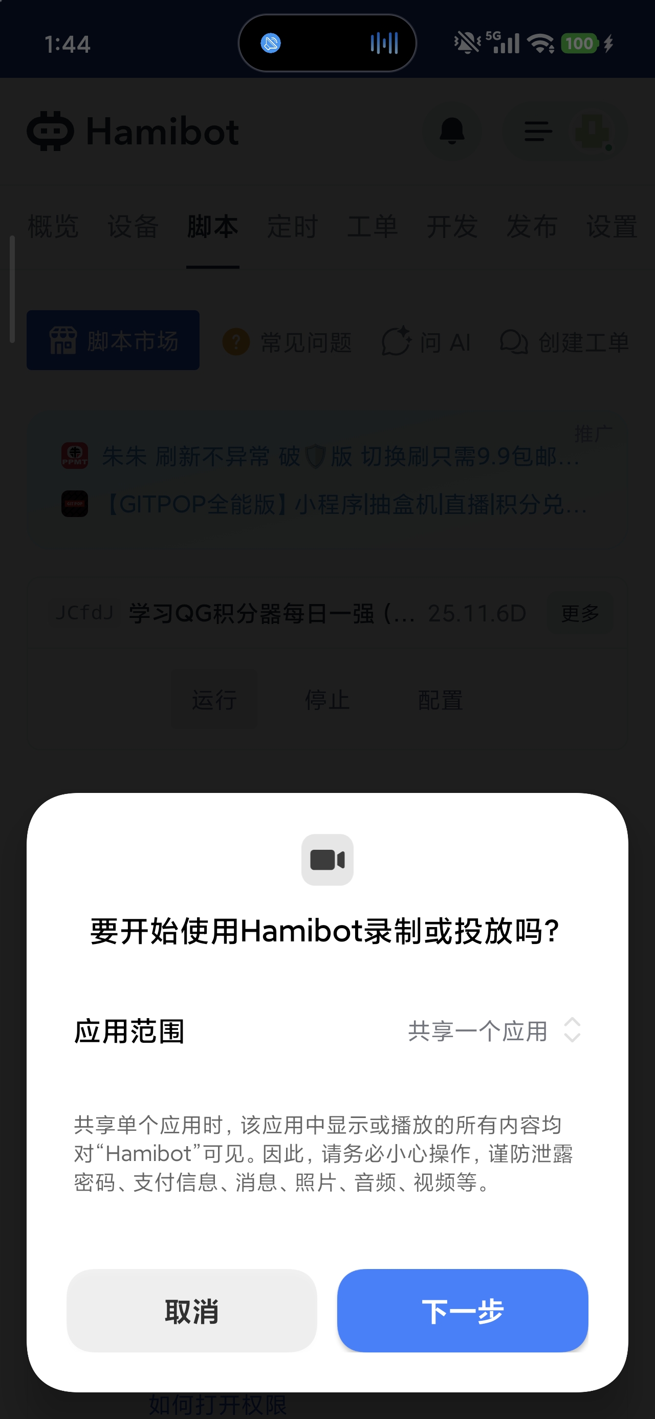 这是因为Hamibot在执行需要屏幕截图功能的脚本时,系统会请求屏幕录制权限。根据你的截图显示,这是Android系统的权限请求界面,不同手机品牌可能显示为"录制和投放"、"屏幕录制"或类似名称。